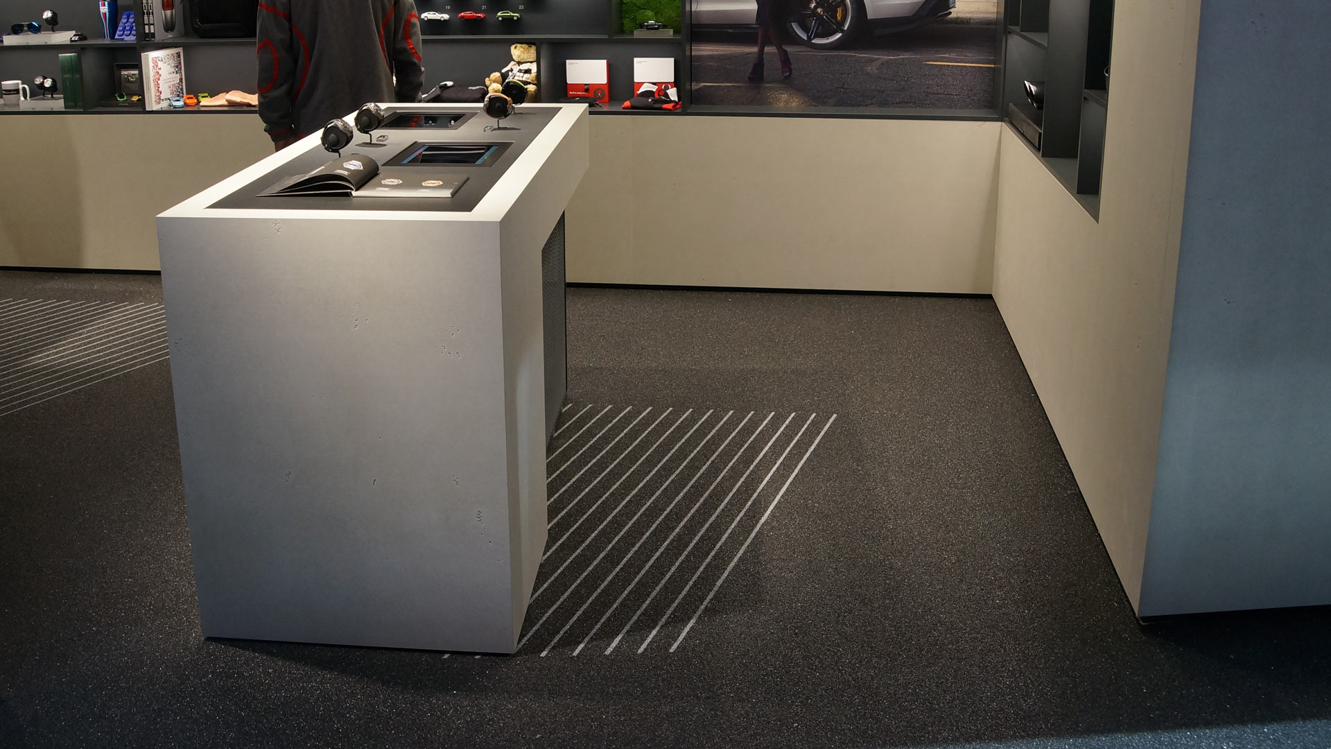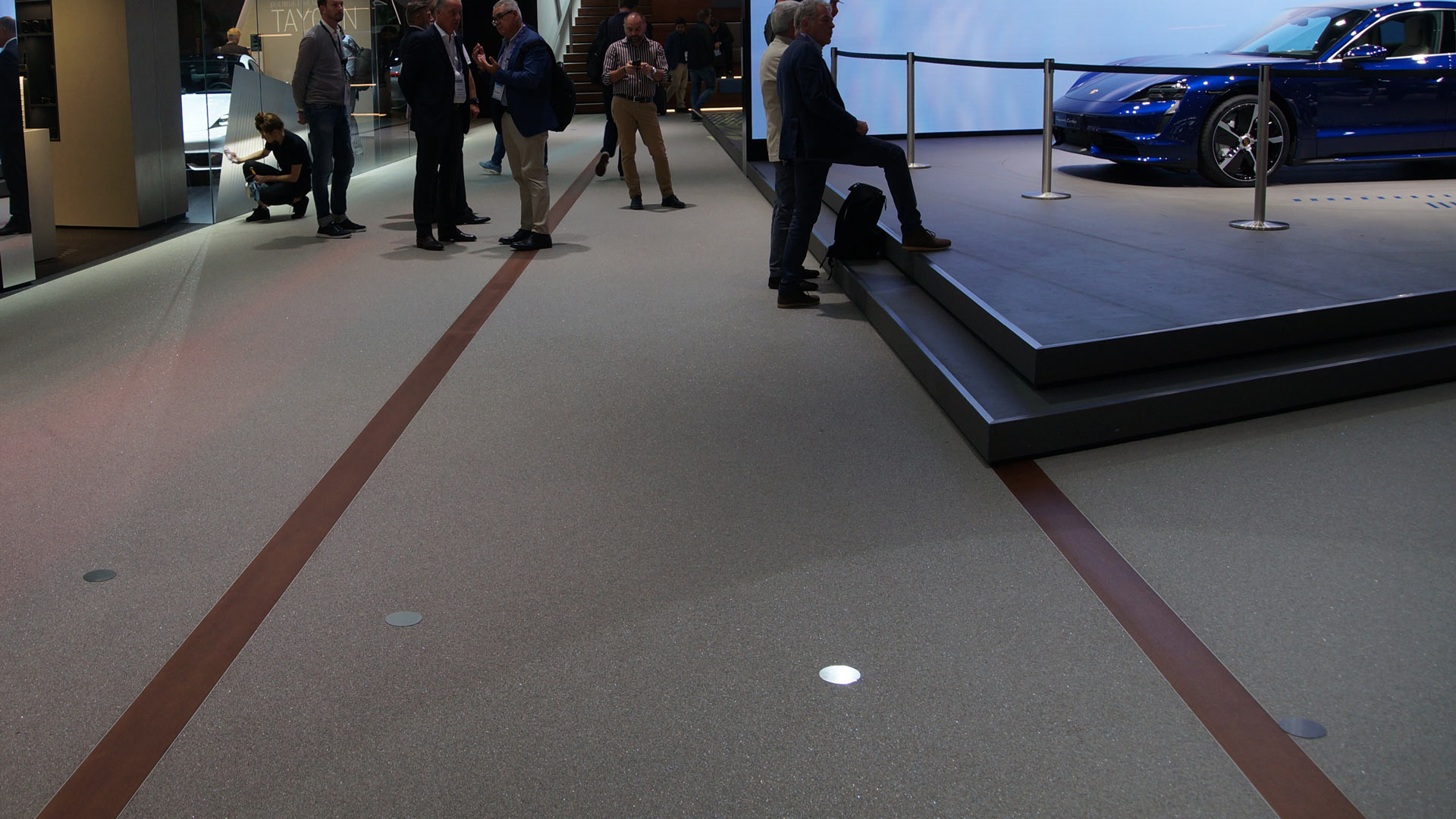 Über 950 m2 Steingranulat wurde für Porsche auf der Messe Frankfurt verlegt. Der Sportwagenhersteller zeigte damit an den 10 Tagen mit einem beeindruckenden Gesamtkonzept, dass es eben nicht nur auf ein gutes Standdesign, sondern auch auf den richtigen Bodenbelag ankommt. Kombiniert mit Oberflächen aus Echtholz, Beton, Steinfurnier und Spiegeln verließ der Gast die Messe mit Betreten des Standes – und fand sich in einem großzügigen Autohaus wieder.