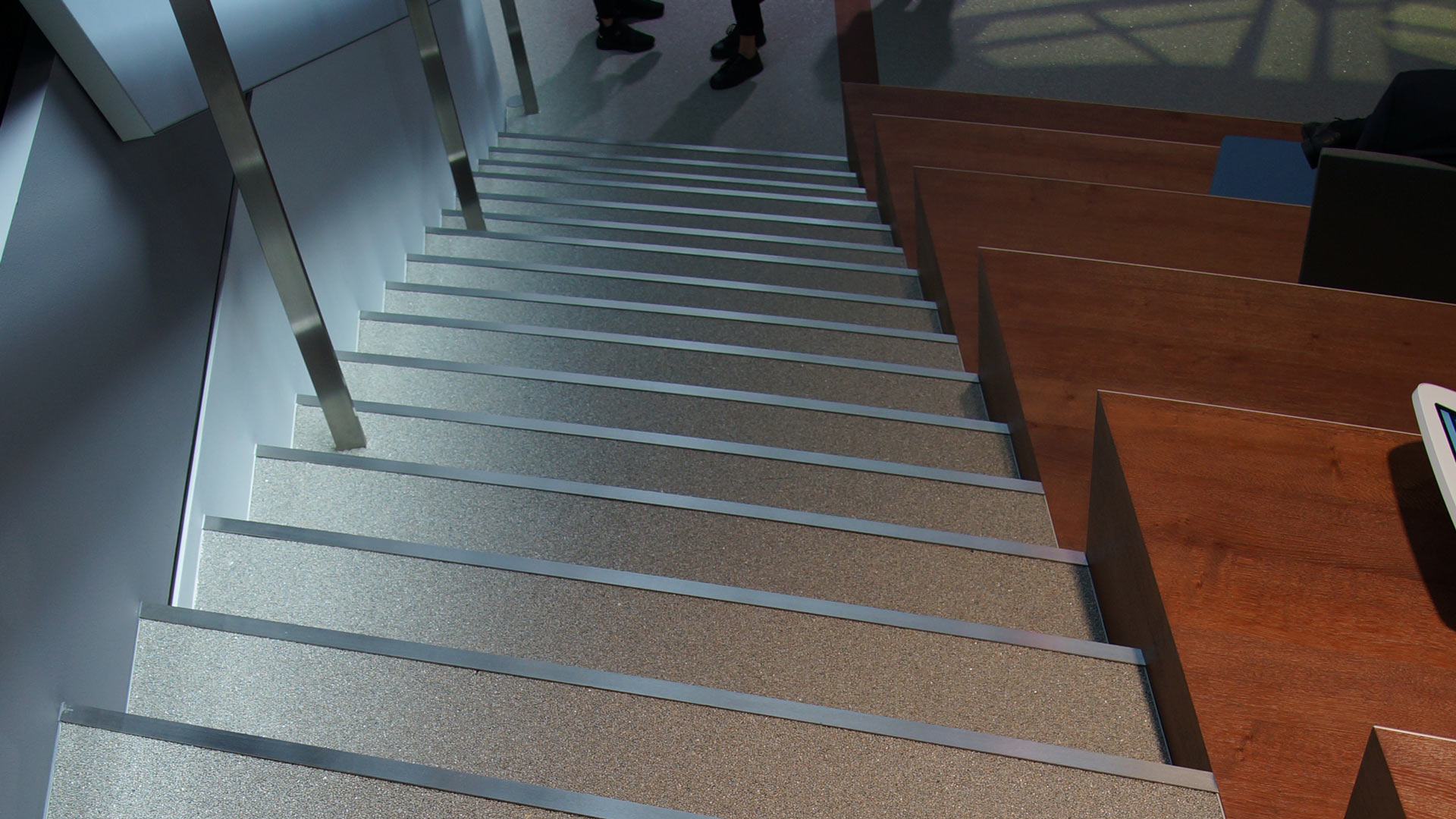 Für das Standkonzept kamen insgesamt drei verschiedene Farben in jeweils der gleichen Körnung zum Einsatz. Knapp 650 m2 der Standfläche wurden mit Steingranulat in seidengrau ausgelegt, die restlichen knapp 300 m2 mit reinweiß und doppelt gef&aauml;rbtem schwarz. Zusätzliche Highlights wurden mit Intarsien aus Holz, Metall und verschiedenfarbigen Steingranulaten gesetzt.